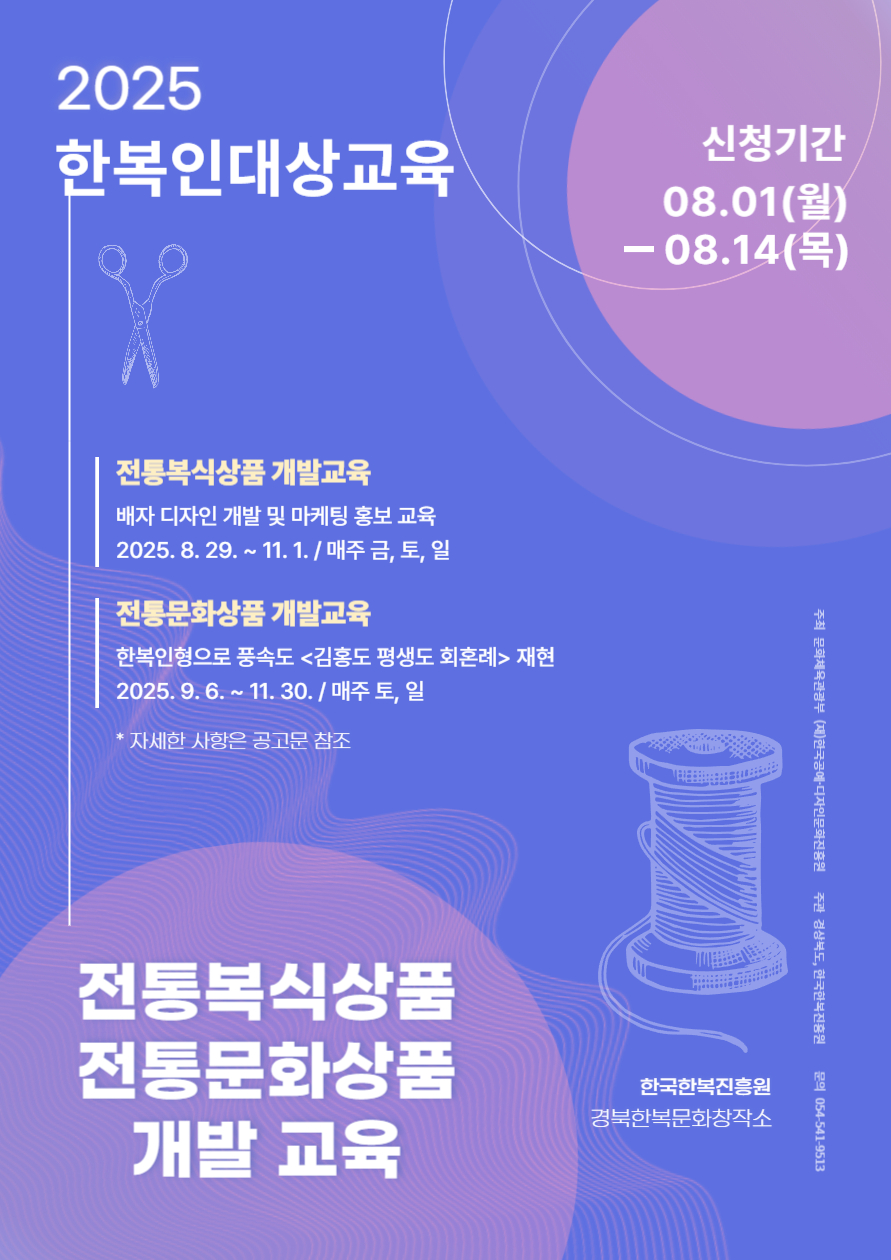 한국한복진흥원은 경북한복문화창작소 공간을 활용한 한복분야 전문인력 양성의 기반을 마련하고 한복문화산업 경쟁력을 강화하기 위해 <2025 한복인 대상 교육프로그램>을 다음과 같이 실시하오니 많은 관심과 참여를 부탁드립니다.